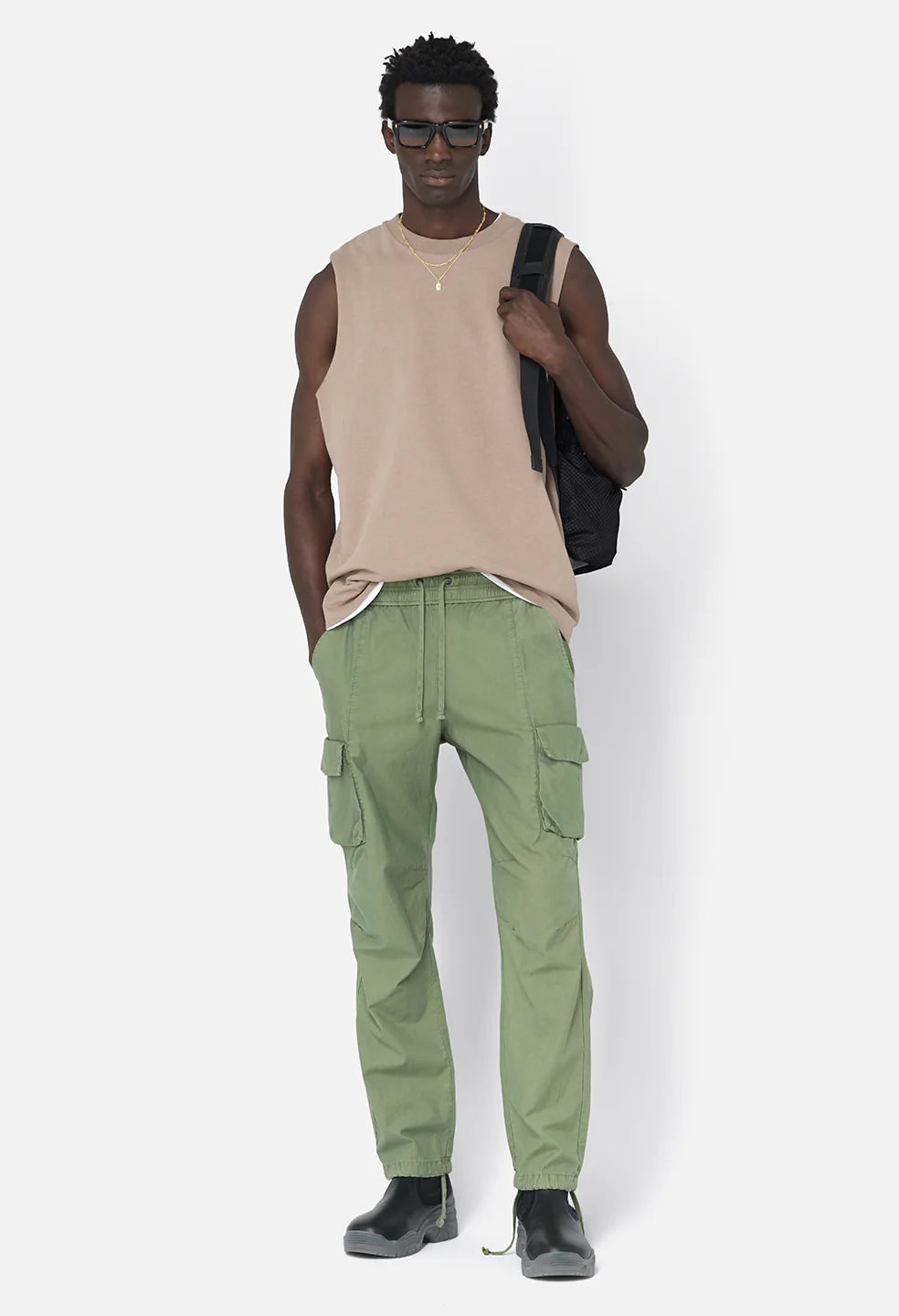 Relaxed fit cargo pants in washed compact cotton. These pants feature knee pleats, two slant pockets at the front, two pockets at the seat, and dual use cargo pockets with a bucket opening and snap flap pocket. Adjustable waistband and hems with drawstring closures. Made in China.