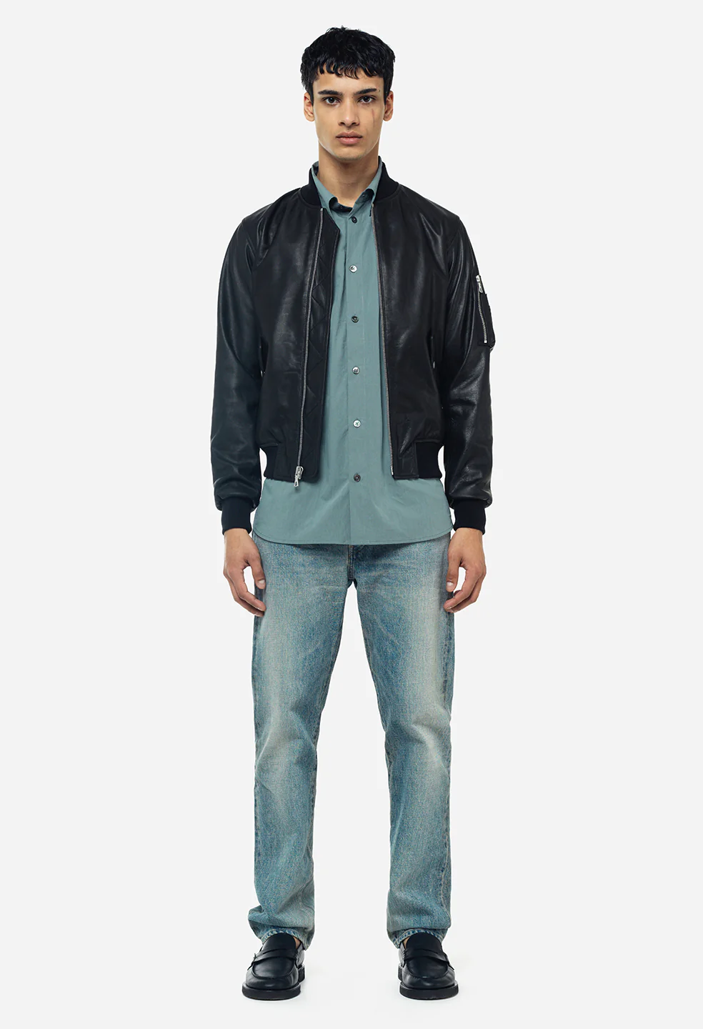 Classic bomber jacket in premium European leather. Full zip closure, two snap flap pockets at the front, and a zip pocket and snap pen pocket at the left arm. Darts at the back shoulders. Rib knit collar, hem, and sleeves. Satin lined interior. Riri hardware. Made in Los Angeles.