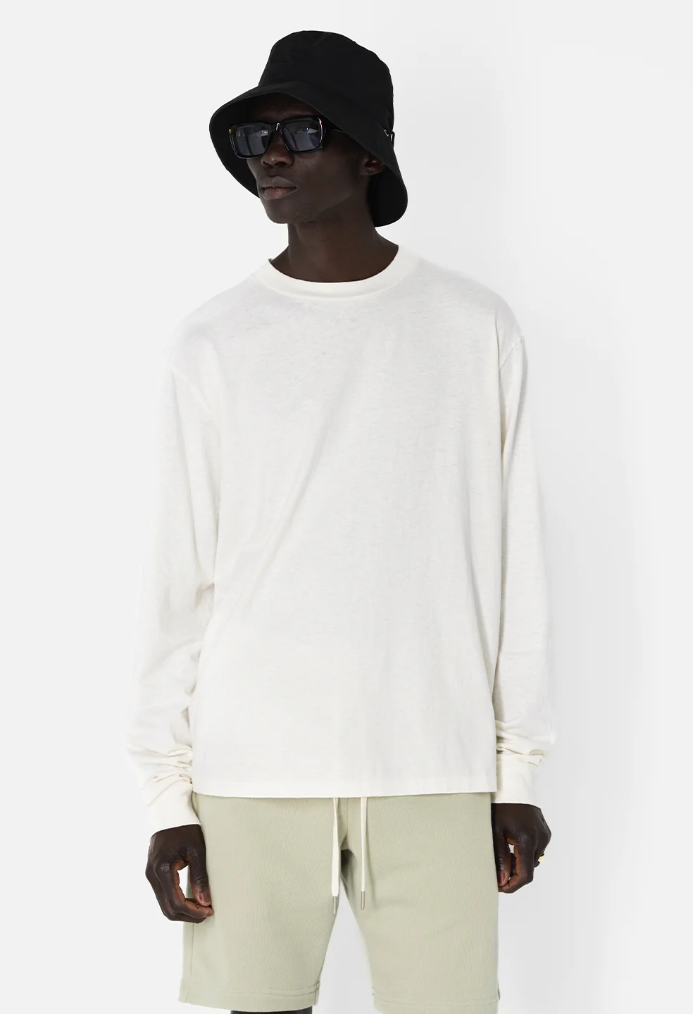 Oversized long sleeve tee with a relaxed neck and slightly longer than average length. This tee is designed with recycled cotton and features a vintage-inspired blind stitch detail at the sleeves and hem. Ribbed neck and cuffs.
