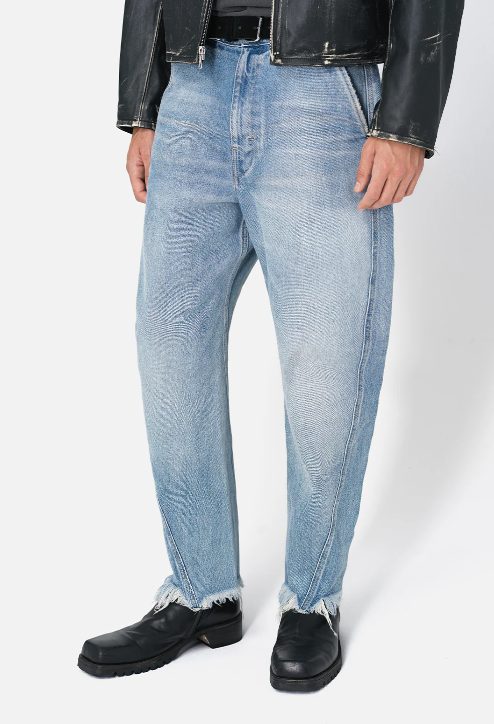 Relaxed and cropped fit denim trousers. Japanese 3X1 denim in 90's inspired black wash. Subtle distressing throughout. Asymmetrical seams are designed to create shape. These pants feature two slant pockets at the front, two welt pockets at the back, and a welt pocket at the side. Belt loops at the waist. Zip fly. Made in Japan.