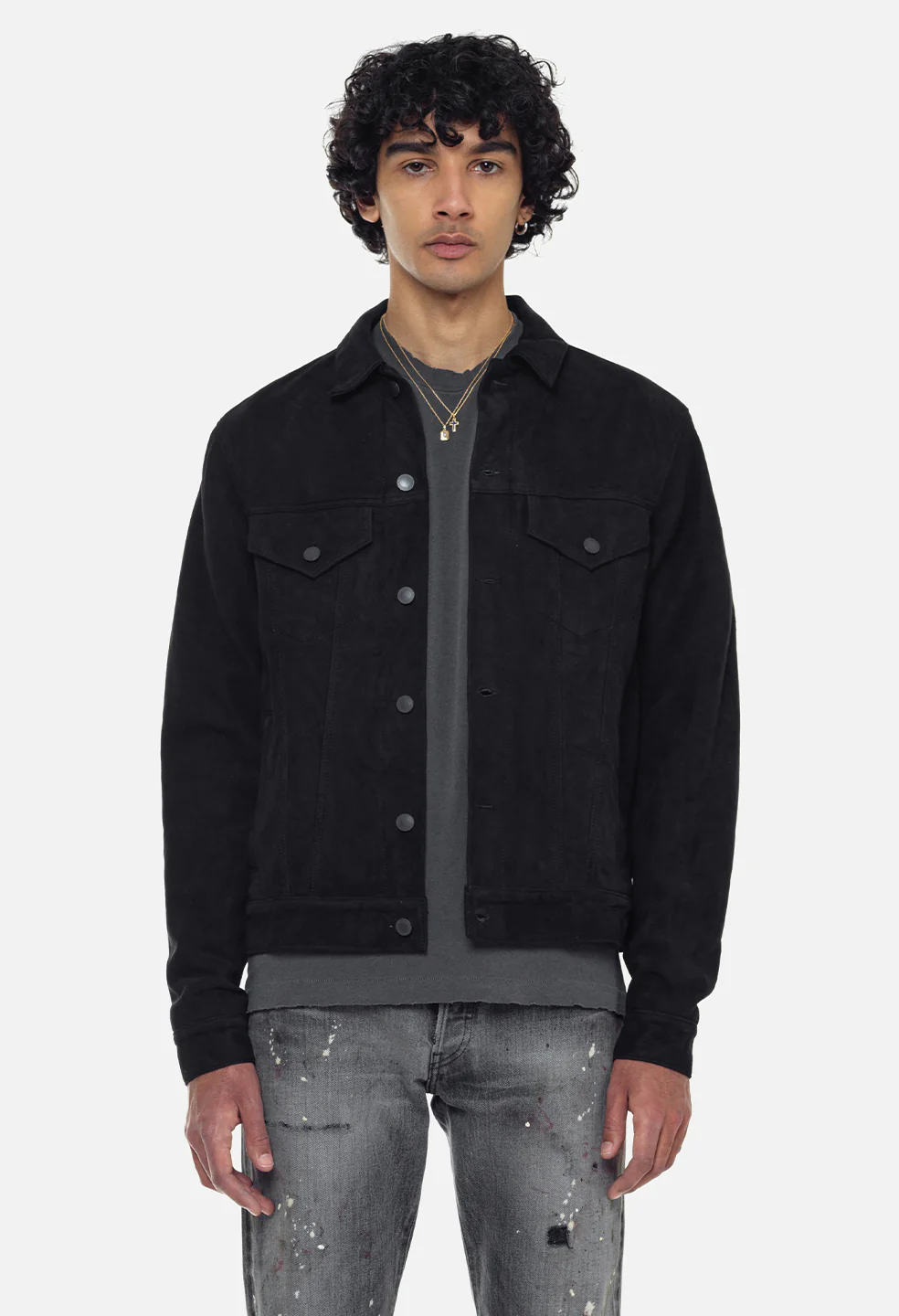 Classic type III trucker jacket crafted in premium European suede. Button closure with two pointed flap pockets, side pockets, and waistband tabs. Branded hardware. Tonal stitching. Made in Los Angeles.
