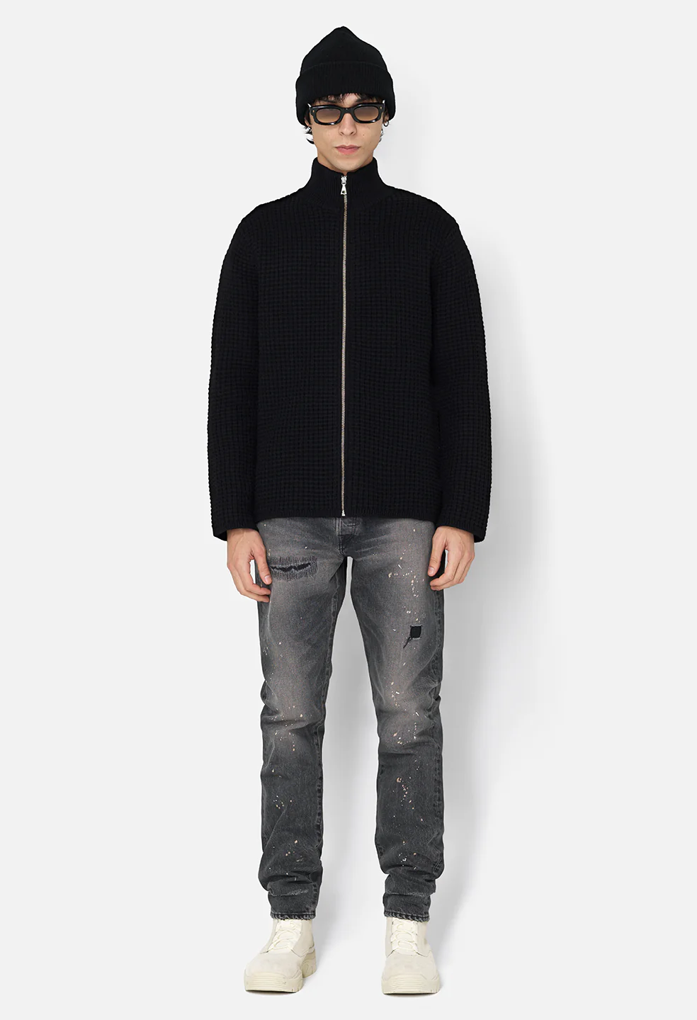 Wool Waffle Knit Full-Zip / Black